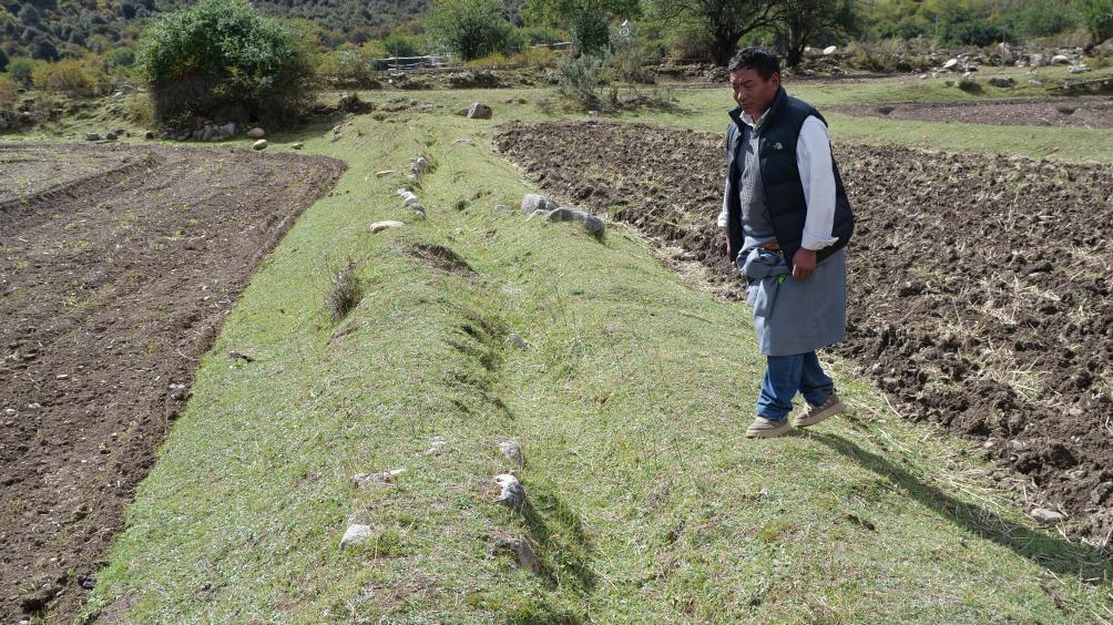 10月21日,忠玉村黨支部書(shū)記才旺多吉查看土石夯成的老水渠。新華社記者魏冠宇 攝