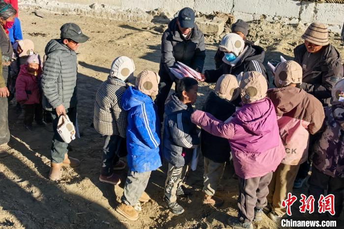 圖為1月12日,桑杰尼瑪將同事們籌款購買的保暖帽分發(fā)給村里的孩子們。受訪者 供圖