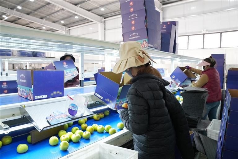除了田間基地,蘋(píng)果產(chǎn)業(yè)鏈的延伸還為群眾帶來(lái)了更多就業(yè)選擇。位于洞嘎鎮(zhèn)巴基塘的智能化蘋(píng)果分揀車(chē)間于今年新建落成,車(chē)間內(nèi)流水線高效運(yùn)轉(zhuǎn),工人們熟練地分揀、裝箱、搬運(yùn)蘋(píng)果,空氣中的果香愈發(fā)濃郁。據(jù)車(chē)間負(fù)責(zé)人介紹,近期正忙著為電商平臺(tái)備貨,每天有16名工人負(fù)責(zé)打包1200余箱蘋(píng)果;因發(fā)貨繁忙,車(chē)間還額外雇傭了當(dāng)?shù)嘏R時(shí)工,讓農(nóng)閑群眾多了一份收入。