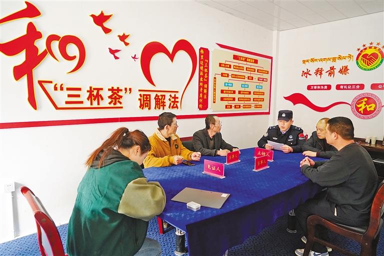 圖為帕里邊境派出所民警在“三杯茶”調(diào)解室調(diào)處矛盾糾紛。 記者 張宇 通訊員 白瑪倉覺 攝