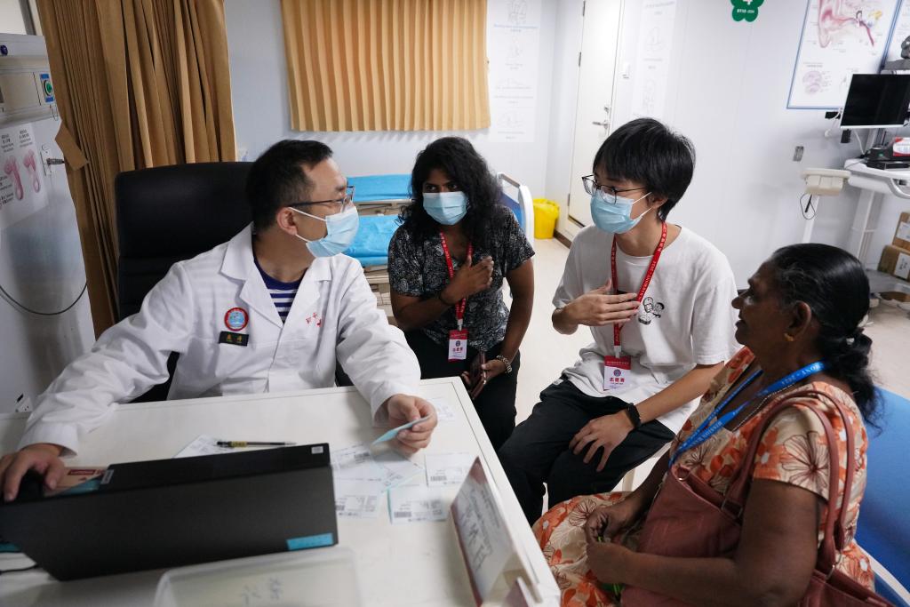 2024年12月24日,在斯里蘭卡科倫坡港,中國海軍“和平方舟”號醫(yī)院船上的醫(yī)生在志愿者的幫助下對當(dāng)?shù)鼗颊哌M(jìn)行問診。(新華社記者伍岳攝)