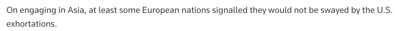 文章注意到歐盟外交與安全政策高級(jí)代表卡婭·卡拉斯的發(fā)言,稱(chēng)她似乎將歐盟定位為亞洲富有成效的合作伙伴。她認(rèn)為,亞洲或許可以成為一種新選擇,以應(yīng)對(duì)美國(guó)如今的日益反復(fù)無(wú)常、奉行保護(hù)主義,以及不再重視基于規(guī)則的國(guó)際秩序。