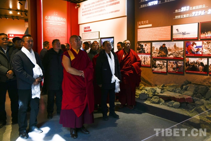 圖為第十一世班禪額爾德尼·確吉杰布在定日縣6.8級地震受災影響最嚴重的村莊之一森嘎村村史館調研災后重建情況 攝影:趙振宇