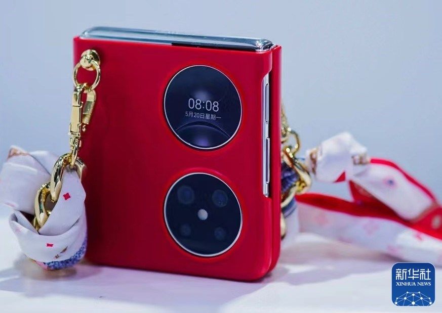 圖為華為展臺(tái)展出的新款折疊手機(jī)