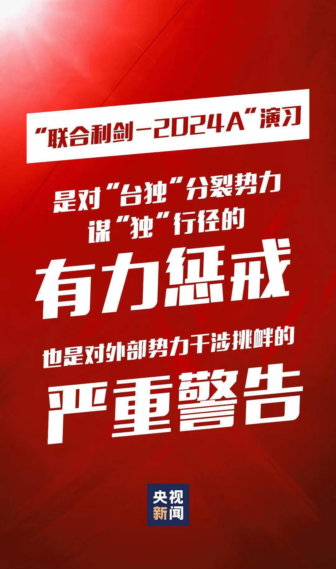 5月23日至24日,中國人民解放軍東部戰(zhàn)區(qū)組織戰(zhàn)區(qū)陸軍、海軍、空軍、火箭軍等兵力,位臺島周邊開展“聯(lián)合利劍-2024A”演習(xí),重點演練聯(lián)合??諔?zhàn)備警巡、聯(lián)合奪取戰(zhàn)場綜合控制權(quán)、聯(lián)合精打要害目標(biāo)等科目,艦機(jī)抵近臺島周邊戰(zhàn)巡,島鏈內(nèi)外一體聯(lián)動,檢驗戰(zhàn)區(qū)部隊聯(lián)合作戰(zhàn)實戰(zhàn)能力。這是中國維護(hù)國家主權(quán)和領(lǐng)土完整的正義之舉,也是對“臺獨”分裂勢力謀“獨”行徑的有力懲戒,對外部勢力干涉挑釁的嚴(yán)重警告。