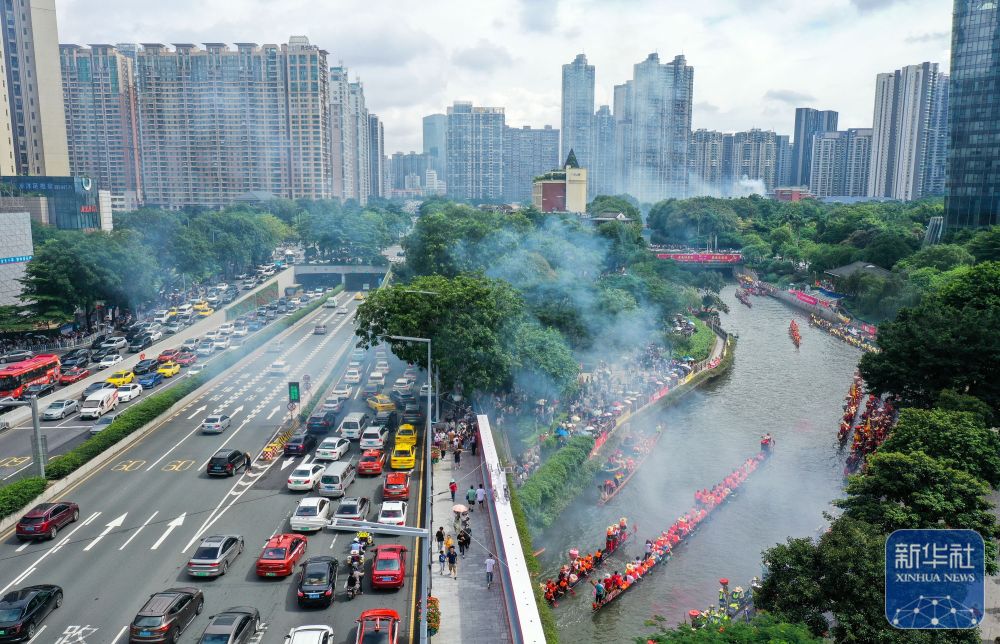 6月10日,獵德村熱鬧的傳統(tǒng)龍舟“龍船景”與繁忙的現(xiàn)代都市交匯相融(無人機(jī)照片)?!褒埓啊笔菑V府地區(qū)水鄉(xiāng)在端午期間舉辦的一種民俗活動(dòng)。新華社記者 劉大偉 攝