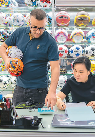 近期,體育賽事相關(guān)商品熱度持續(xù)攀升。在浙江金華義烏國際商貿(mào)城,各種體育用品、飾品、戶外產(chǎn)品等吸引了不少海內(nèi)外客商下單。圖為外商在選購體育用品。