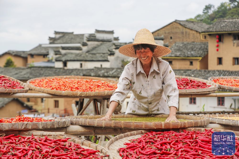 9月22日,在安徽省黃山市歙縣陽(yáng)產(chǎn)村,村民在土樓前晾曬農(nóng)作物。