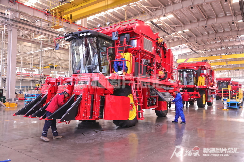 2024年3月12日,工人在位于五家渠市的新疆天鵝現(xiàn)代農業(yè)機械裝備有限公司采棉機生產線上生產采棉機。李華北攝