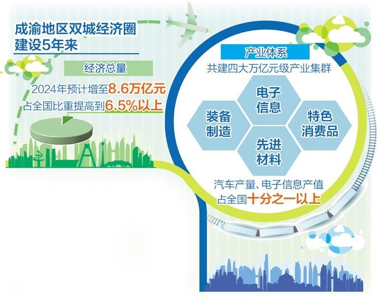 一是具有全國影響力的重要經(jīng)濟(jì)中心建設(shè)實(shí)現(xiàn)新躍升。經(jīng)濟(jì)總量上,雙城經(jīng)濟(jì)圈地區(qū)生產(chǎn)總值5年邁上了兩個(gè)萬億元級臺(tái)階,2024年預(yù)計(jì)增至8.6萬億元,占全國的比重由6.3%提高到6.5%以上;產(chǎn)業(yè)體系上,兩地共建電子信息、裝備制造、先進(jìn)材料、特色消費(fèi)品四大萬億元級的產(chǎn)業(yè)集群,汽車產(chǎn)量、電子信息產(chǎn)值占全國十分之一以上。