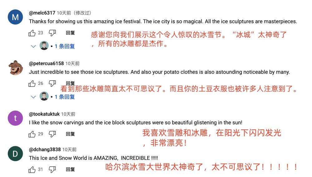 眾多海外博主仿佛找到了“流量密碼”,那就是發(fā)布來哈爾濱旅行Vlog,上傳和冰雕的打卡美照,評論區(qū)互動好評如潮。