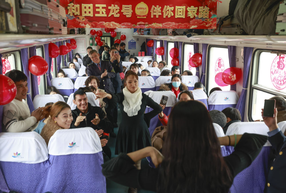 這次坐車,布麥熱姆發(fā)現(xiàn)了新變化:車廂的連接處貼上了對聯(lián),車窗上多了喜慶的窗花?!盎丶液髱臀覌尨驋咝l(wèi)生,再給她包個(gè)紅包。”布麥熱姆說,年味十足的車廂倒是提醒他,回家要抓緊備年貨了。