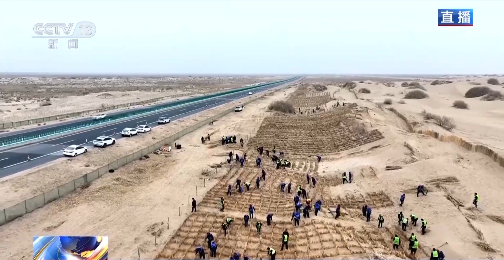總臺記者從新疆巴楚縣阿克薩克馬熱勒鄉(xiāng)防沙治沙工程施工現(xiàn)場發(fā)回報道。當?shù)氐?00多名各族干部群眾人工鋪設“草方格”,也就是將干蘆葦鋪設在地面,再壓進沙土中,它的主要作用是固沙。