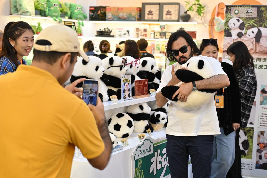 2024年9月16日,參觀者在2024年服貿(mào)會(huì)首鋼園區(qū)文旅服務(wù)專(zhuān)題展區(qū)抱著北京動(dòng)物園推出的大熊貓文創(chuàng)玩偶合影。新華社記者 李鑫 攝