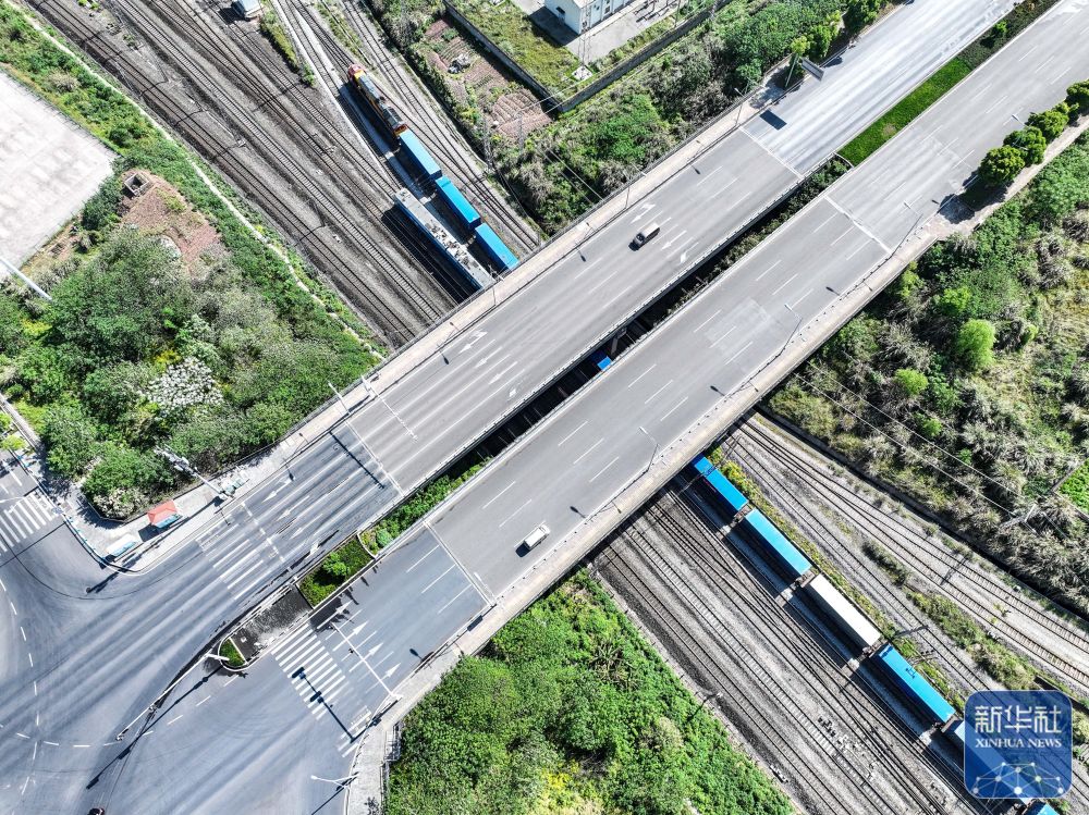 4月20日,圖定中亞班列在重慶團結(jié)村中心站等候發(fā)車(無人機照片)。