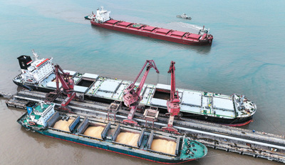 圖為4月24日,一艘滿載巴西大豆的散貨船駛?cè)雽幉ㄖ凵礁劾咸辽阶鳂I(yè)區(qū),靠泊該港區(qū)三期1號泊位。姚峰攝(人民視覺)