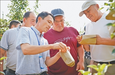 近日,2025年首期中國—中亞五國職業(yè)農(nóng)民培訓(xùn)班在陜西渭南開班。圖為學(xué)員們在西北農(nóng)林科技大學(xué)蘋果試驗站了解蘋果套袋知識。