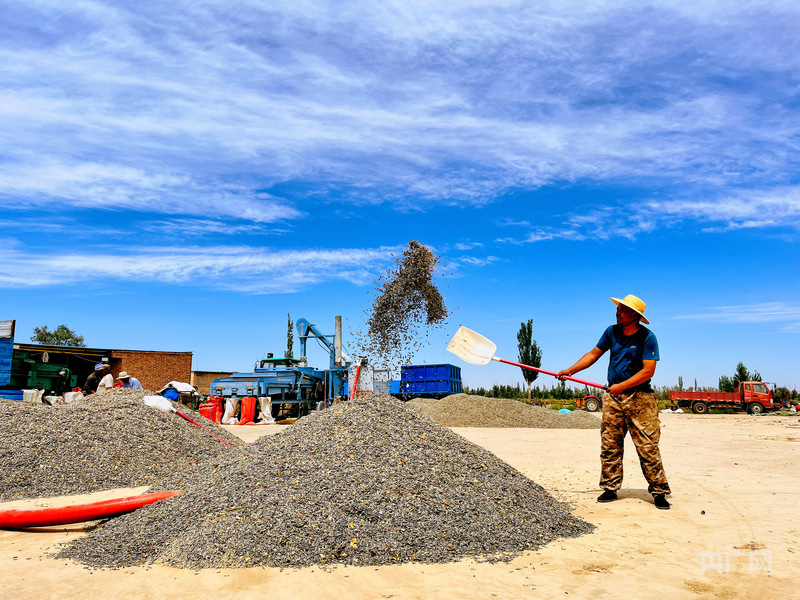 農(nóng)民在藍(lán)天下奮力鏟揚(yáng)作物,豐收的喜悅在堆場(chǎng)彌漫(央廣網(wǎng)發(fā) 徐曉瑤 攝)