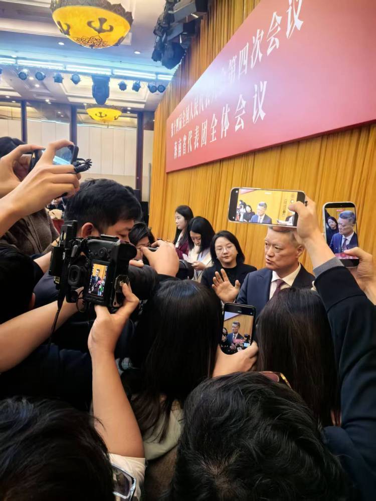 △海南代表團(tuán)開放團(tuán)組活動(dòng),中外媒體記者會(huì)后采訪全國人大代表、海南省人民政府秘書長蔡強(qiáng) 。林路攝