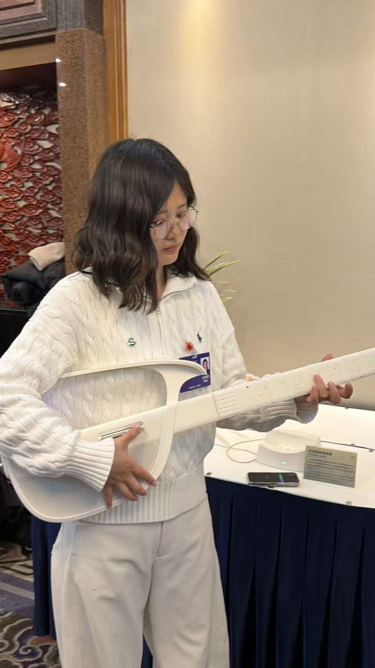△廣東代表團(tuán)的工作人員邊詠馨介紹,這把AI吉他,可以讓人3秒鐘學(xué)會(huì)彈吉他。 林路攝