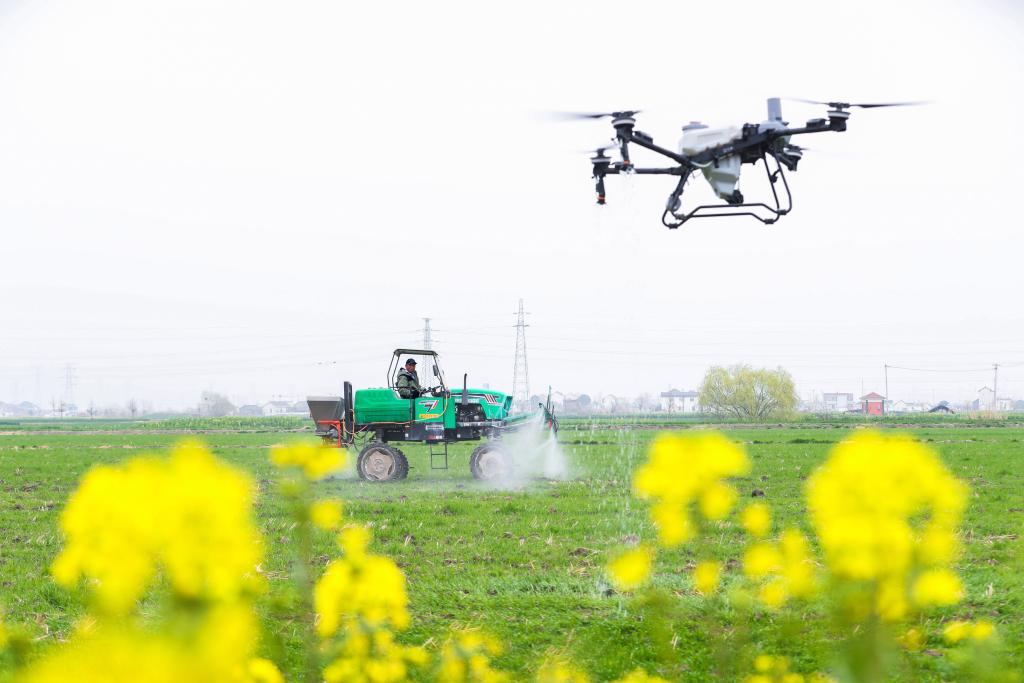 3月13日,在江蘇省興化市陳堡鎮(zhèn)蔣莊村,農(nóng)民駕駛植保無人機、自走式噴桿噴霧機實施雜草防治作業(yè)。新華社發(fā)