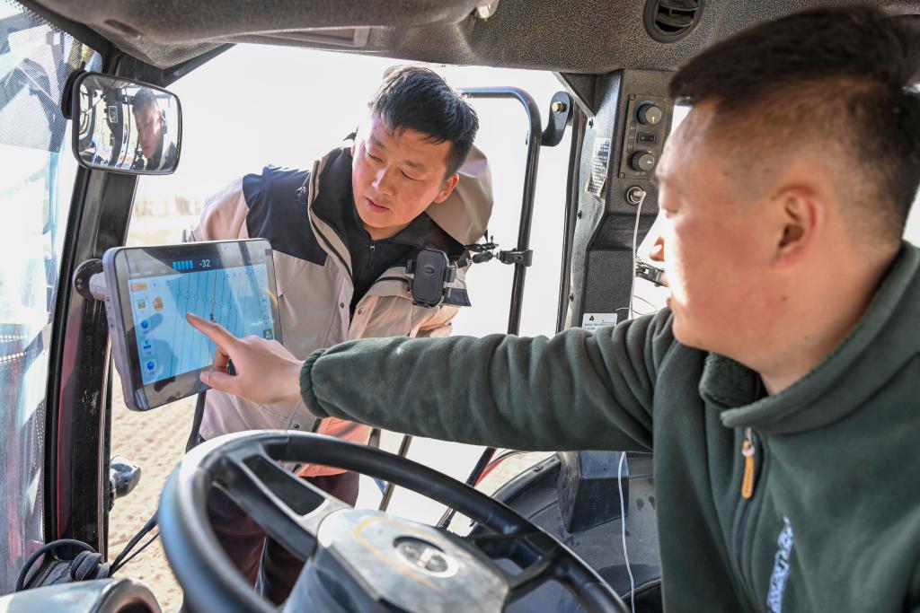 3月24日,在新疆伊犁哈薩克自治州察布查爾錫伯自治縣孫扎齊牛錄鎮(zhèn),羅俊杰(左)和農(nóng)機手查看北斗自動導航系統(tǒng)確定播種地塊 新華社記者 丁磊 攝