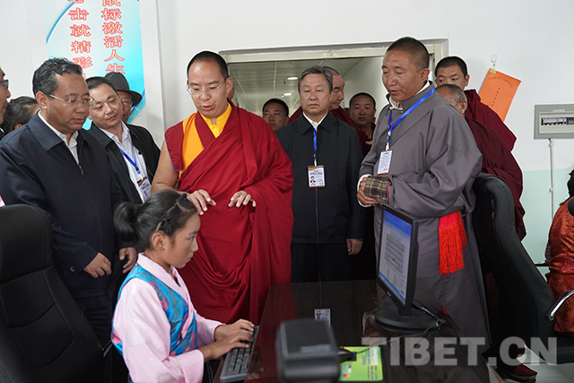 圖為十一世班禪在電教室了解學(xué)生學(xué)習(xí)情況。攝影:王淑