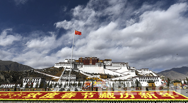 拉薩市園林局負(fù)責(zé)人介紹,3000多盆仿真花卉和4萬余束紅黃兩色的絹花用在布達(dá)拉宮廣場中心位置進(jìn)行地面裝飾,營造春節(jié)、藏歷新年的濃厚氛圍。