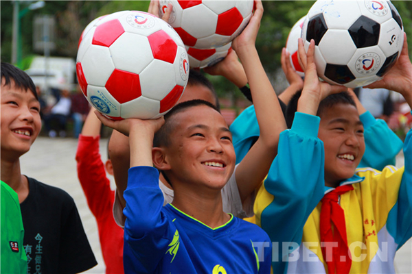 圖為香格里拉市金江鎮(zhèn)小學(xué)孩子拿到“愛心足球”