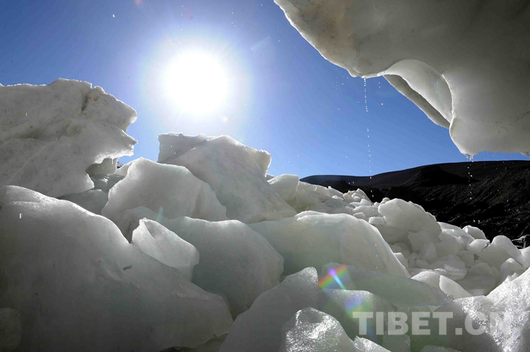 當然,受全球氣候變暖的影響,近年來普若崗日冰原的融水痕跡也很明顯,冰原外圍冰體常見掛滿融水的冰凌;也常見正在融化、殘留地面的許多冰塊及那些從冰川下裸露出的大大小小的石頭。
