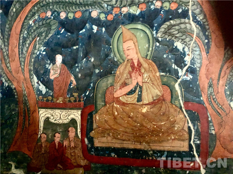 自從朗達瑪滅佛以來,佛教在吐蕃遭到了致命的打擊,一些僧人避難至遙遠的阿里,保存了佛教的火種,并且開啟了藏傳佛教的后弘期。托林寺雖遠在西藏邊緣一隅,卻在藏傳佛教后弘期扮演了重要的角色。11世紀,受阿里地區(qū)的統(tǒng)治者絳曲沃和大譯師仁欽桑布之請,阿底峽由納措催成杰瓦、俄列貝希繞、甲尊僧格等五人到印度迎請來到托林寺,駐寺三年,幫助校譯佛經(jīng)。后又至衛(wèi)藏、拉薩等地譯經(jīng),成為西藏復(fù)興佛教的一位重要人物。關(guān)于這一段歷史的表述,托林寺壁畫中有這樣一幅小圖。圖右邊戴帽者為主佛阿底峽尊者,阿底峽為古印度僧人、佛學(xué)家,聲名極盛。左上角站立者是拉喇嘛絳曲沃,左下三人分別為:譯師納措催成杰瓦、俄列貝希繞、甲尊僧格。