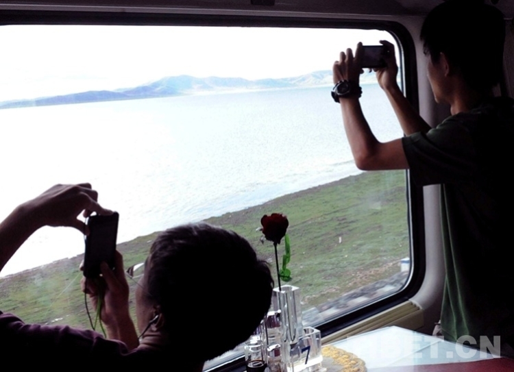 這是京藏列車(chē)通過(guò)西藏錯(cuò)那湖時(shí),旅客們紛紛用手機(jī)拍攝美景(唐召明2012年8月12日攝)