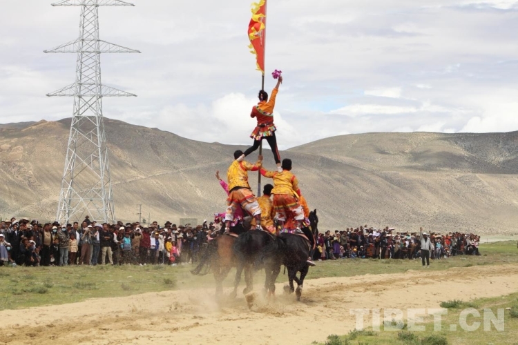 賽馬運(yùn)動是藏族群眾十分喜愛的傳統(tǒng)體育運(yùn)動之一,對于藏族人而言,參加賽馬和觀看賽馬能帶來好運(yùn)。下午,來自西藏自治區(qū)馬術(shù)團(tuán)的選手們通過單人單馬、馬上射箭、馬上拾哈達(dá)、馬上敬酒、馬上仰背、多人多馬等表演,呈現(xiàn)了一場激動人心的馬術(shù)表演。表演期間當(dāng)選手們做出高難度的動作時(shí)現(xiàn)場觀眾神情緊張,當(dāng)選手們順利完成表演時(shí),現(xiàn)場高聲叫好、掌聲連連。