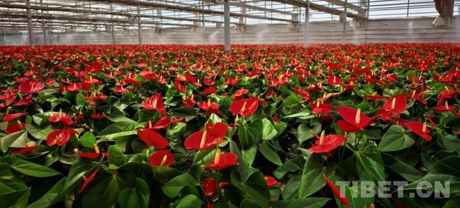 圖為才納園區(qū)溫室里一眼望不到邊的紅掌花卉 攝影:劉莉