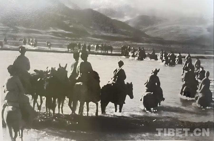 圖為1952年,米福堂精心組織力量,幫助十世班禪和護送部隊在通天河七渡口渡過長江