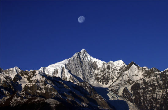 放眼望去,在太陽的金色余暉下,鑲嵌在黛色天地間的梅里雪山或如金枝玉葉,或薄如蟬翼,翩翩起舞、縱橫八荒、獵獵作響,一座座雪峰磅礴巍峨、蒼勁渾雄、大開大合,令人大徹大悟,仿佛得到一次涅槃。夜燃盡,天漸亮,連綿群山此刻又峰回路轉,似乎要重整行裝再出發(fā)。