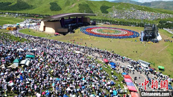 8月4日,人們在當周草原觀看九色甘南香巴拉旅游藝術(shù)節(jié)開幕式表演。(無人機照片)中新社記者 九美旦增 攝