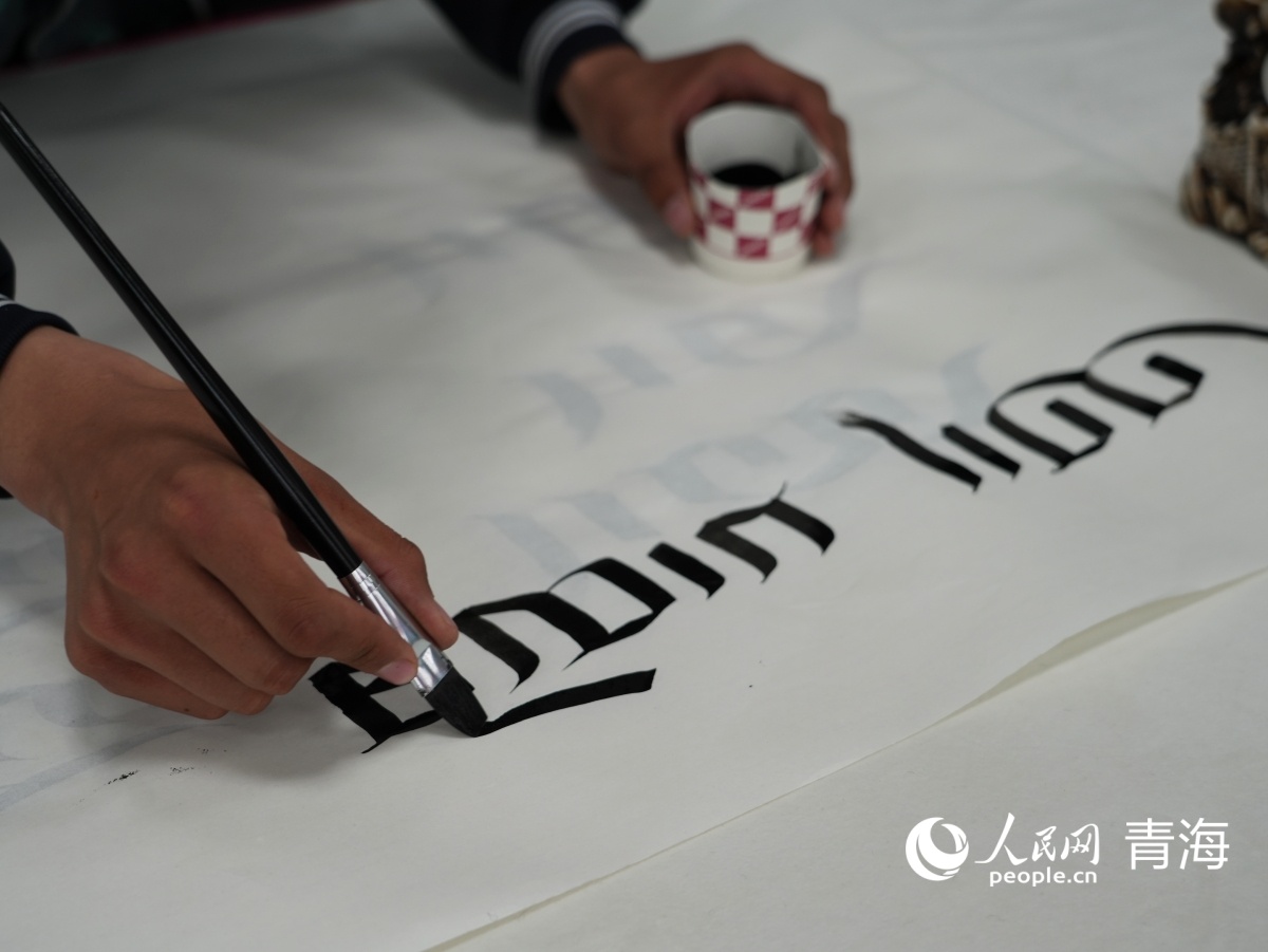 高星級(jí)飯店運(yùn)營(yíng)與管理專業(yè)學(xué)生展示德昂灑智書法技藝。人民網(wǎng)記者 楊啟紅 攝