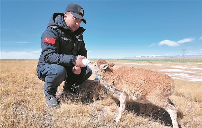 2023年,鬧布東周被調(diào)往卓乃湖保護站,“我們每天出去巡護,遇到受傷的小藏羚羊或者失去母親的藏羚羊孤兒,都會小心翼翼地救回保護站。”鬧布東周說,剛出生的小藏羚羊身體虛弱,不會用奶嘴喝奶,他們就嘴對嘴的方式喂牛奶。