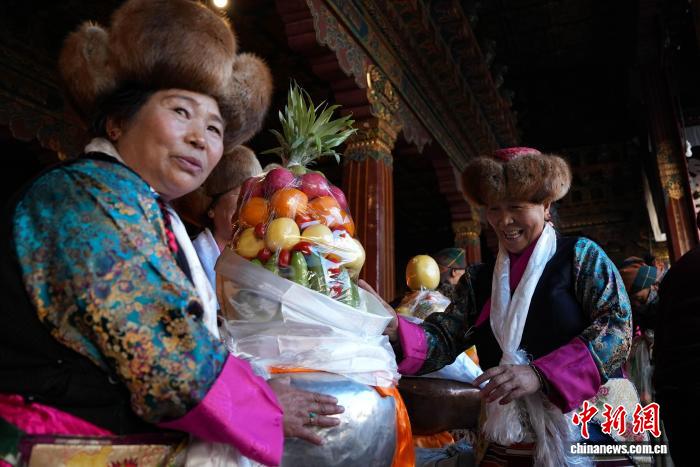 圖為白拉姆節(jié)臨近之際,信眾在大昭寺內(nèi)敬獻(xiàn)供品后載歌載舞的場(chǎng)景。貢確 攝
