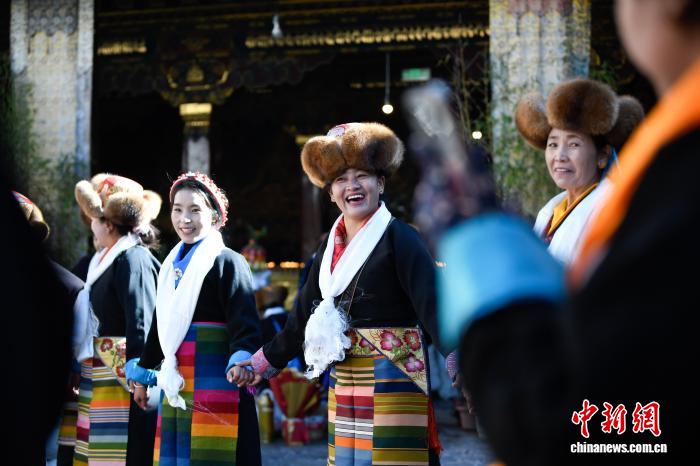 隨著藏歷十月十五白拉姆節(jié)(又稱“仙女節(jié)”)臨近,11月28日,西藏拉薩的婦女們?cè)诖笳阉绿陚鹘y(tǒng)舞蹈后休息,迎接“仙女節(jié)”到來?!跋膳?jié)”即吉祥天母節(jié),藏語稱“白來日追”。相傳藏傳佛教最高護(hù)法神之一班丹拉姆的女兒白拉姆,不顧母親的反對(duì)與赤尊贊私定終身,班丹拉姆一怒之下將赤尊贊趕到拉薩河南岸,規(guī)定二人僅每年的藏歷十月十五日相見。中新社記者 貢嘎來松 攝