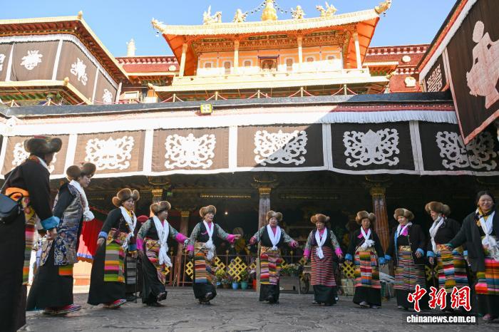 隨著藏歷十月十五白拉姆節(jié)(又稱“仙女節(jié)”)臨近,11月28日,西藏拉薩的婦女們?cè)诖笳阉绿饌鹘y(tǒng)舞蹈,迎接“仙女節(jié)”到來?!跋膳?jié)”即吉祥天母節(jié),藏語稱“白來日追”。相傳藏傳佛教最高護(hù)法神之一班丹拉姆的女兒白拉姆,不顧母親的反對(duì)與赤尊贊私定終身,班丹拉姆一怒之下將赤尊贊趕到拉薩河南岸,規(guī)定二人僅每年的藏歷十月十五日相見。中新社記者 貢嘎來松 攝