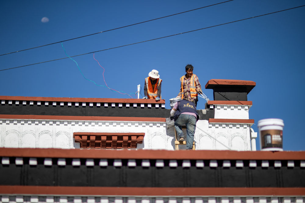 2025年8月11日,定日縣曲洛鄉(xiāng)措昂村彩繪工匠扎西、旦增貢加、拉巴在工作現(xiàn)場。他們都是本村受災群眾,通過參與新房建設獲得勞動報酬。