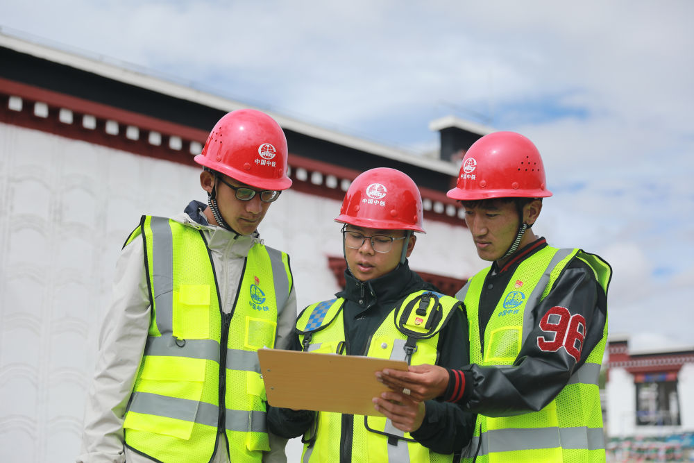 2025年8月10日,技術人員在中國中鐵定日縣曲洛鄉(xiāng)措昂村民房恢復重建項目施工現(xiàn)場商討方案。