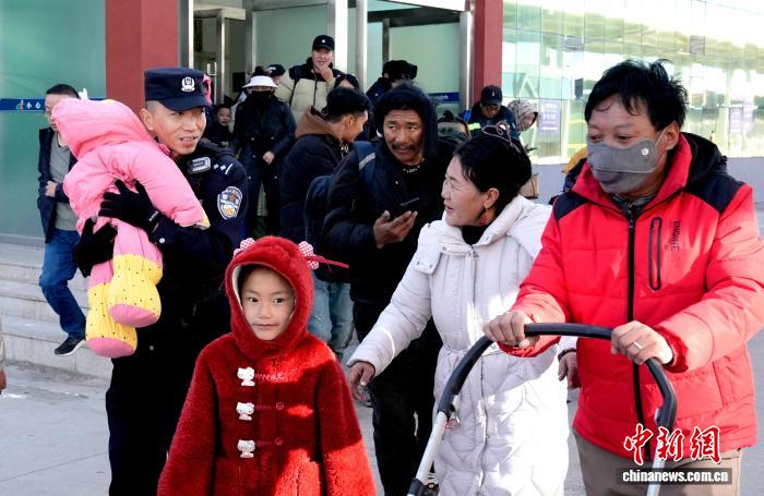 圖為那曲站派出所民警幫助進站老百姓。李林?jǐn)z