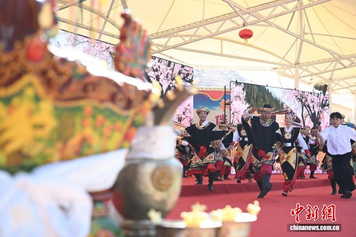 圖為羊湖民間藝術團演員表演舞蹈《嘎拉村的歡笑》。中新社記者 貢嘎來松 攝