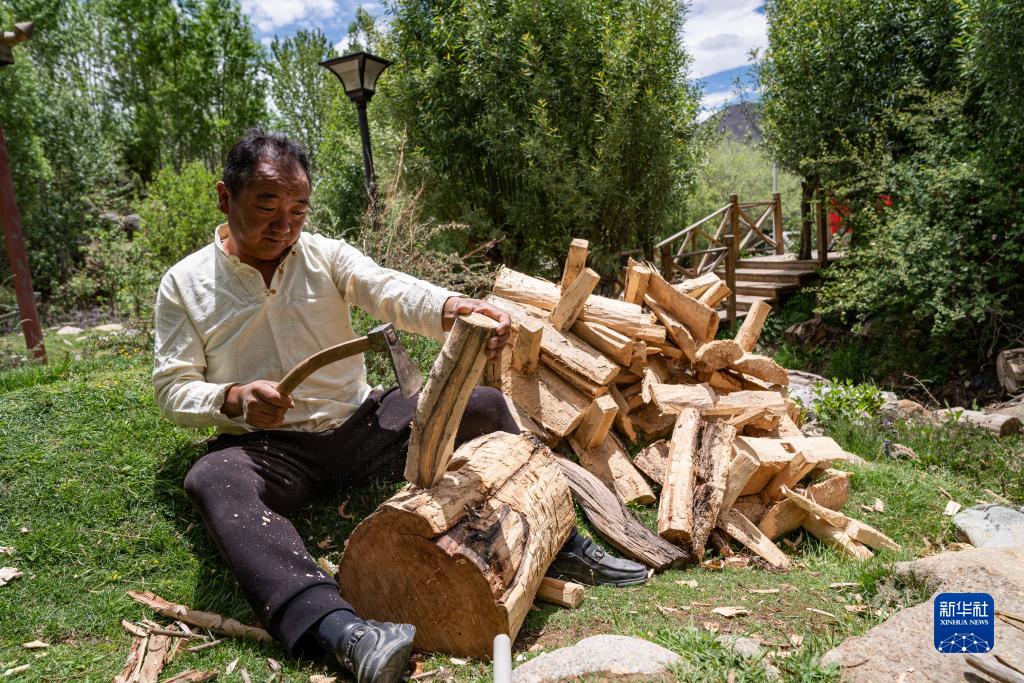 在西藏尼木縣吞巴鎮(zhèn)吞達(dá)村,次仁多吉在砍削柏木,為藏香制作準(zhǔn)備原料(6月9日攝)。新華社記者 孫非 攝