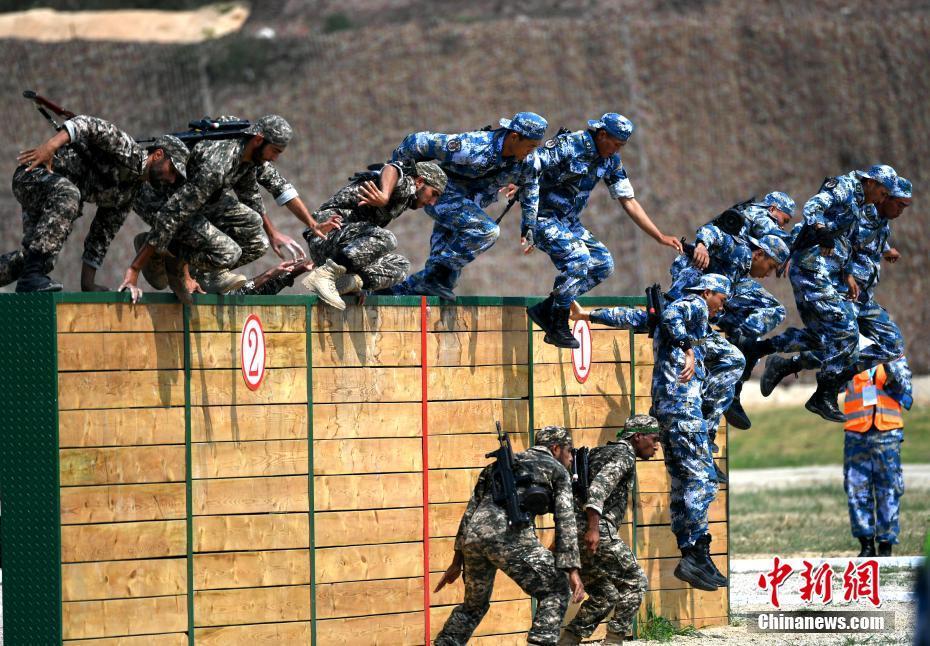 7月30日,“國(guó)際軍事比賽—2018”海上登陸賽障礙賽在中國(guó)泉州石獅賽區(qū)展開(kāi)。中國(guó)、伊朗、俄羅斯、蘇丹、委內(nèi)瑞拉五國(guó)參賽隊(duì)的13個(gè)陸戰(zhàn)班展開(kāi)障礙賽的角逐。經(jīng)過(guò)7個(gè)波次的激烈角逐,中國(guó)代表隊(duì)3個(gè)陸戰(zhàn)班分別以7分51秒、7分58秒、8分35秒包攬障礙賽前3名。圖為中國(guó)隊(duì)員和伊朗隊(duì)員在比賽中。中新社記者王東明 攝