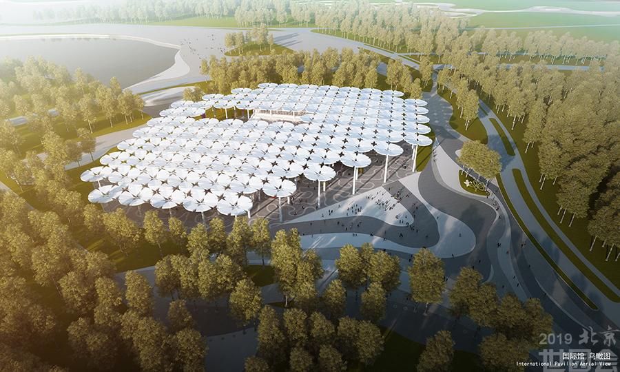 國際館在北京世園會會期承擔(dān)世界各國、國際組織室內(nèi)展覽以及舉辦國際園藝競賽的功能。它由94把花傘構(gòu)成,如同一片花海飄落在園區(qū)里。無論是在高空俯瞰,還是在傘下信步,游客都會被這一片獨特的花海所吸引而流連忘返。當夜幕降臨,花傘葉片上的投射燈將會為場館營造出多姿多彩的夜景。