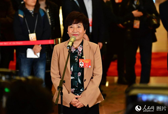 全國(guó)政協(xié)委員、貴州盤(pán)州淤泥鄉(xiāng)巖博聯(lián)村黨委書(shū)記余留芬接受記者采訪(fǎng)。人民網(wǎng)記者 于凱 攝